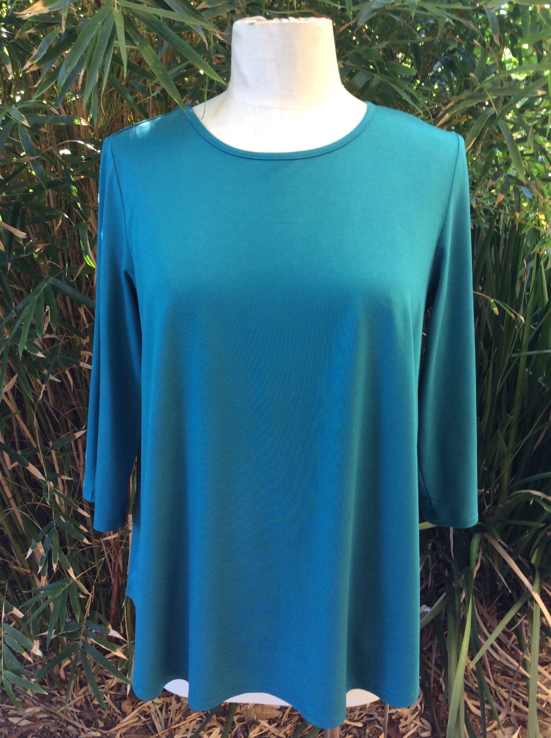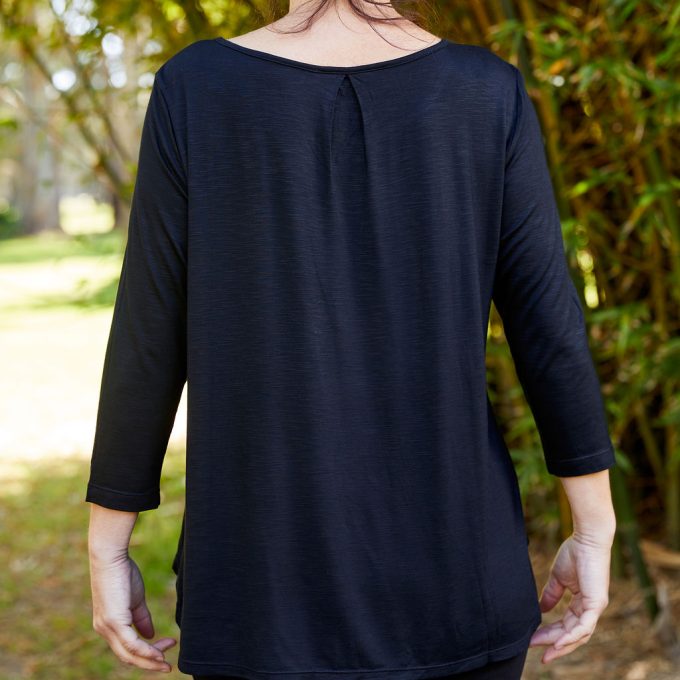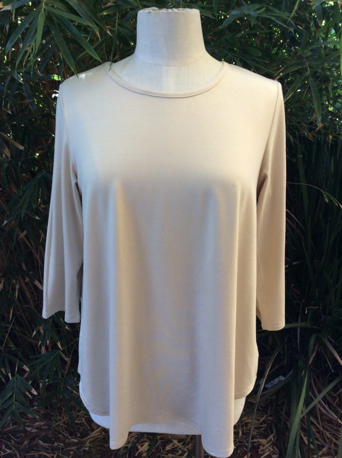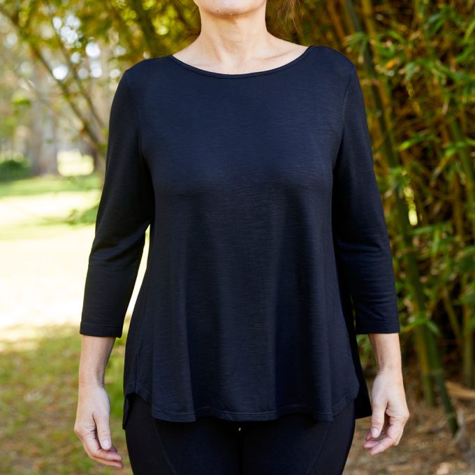 This Bamboo Swing Tee with a 3/4 sleeve is the ultimate in pure comfort, it’s slightly longer at the back with a generous panel that covers the bottom,  draping beautifully without clinging.